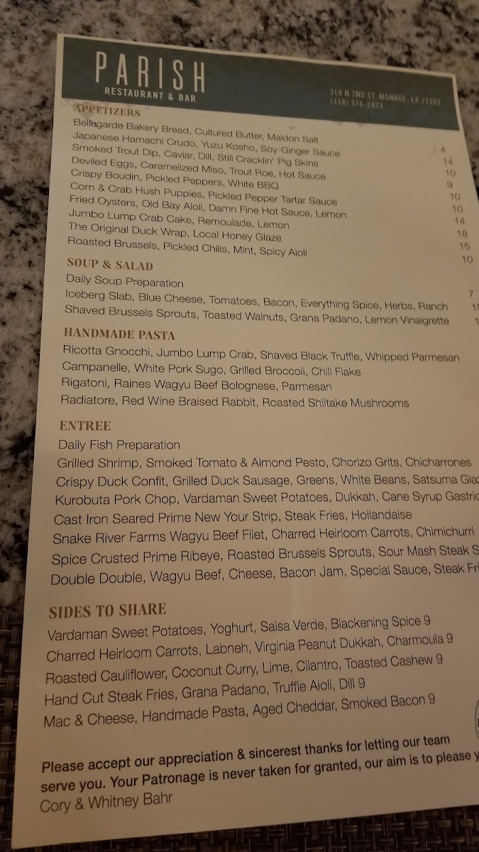 Welcome to Parish Restaurant & Bar, a culinary gem located in Monroe, Louisiana. This vibrant establishment beckons food lovers with its thoughtfully curated menu that showcases the finest local ingredients and innovative flavor combinations. Start your culinary journey with enticing appetizers like the Japanese Hamachi Crudo and Crispy Boudin, or indulge in the rich Deviled Eggs topped with caramelized miso and trout roe.