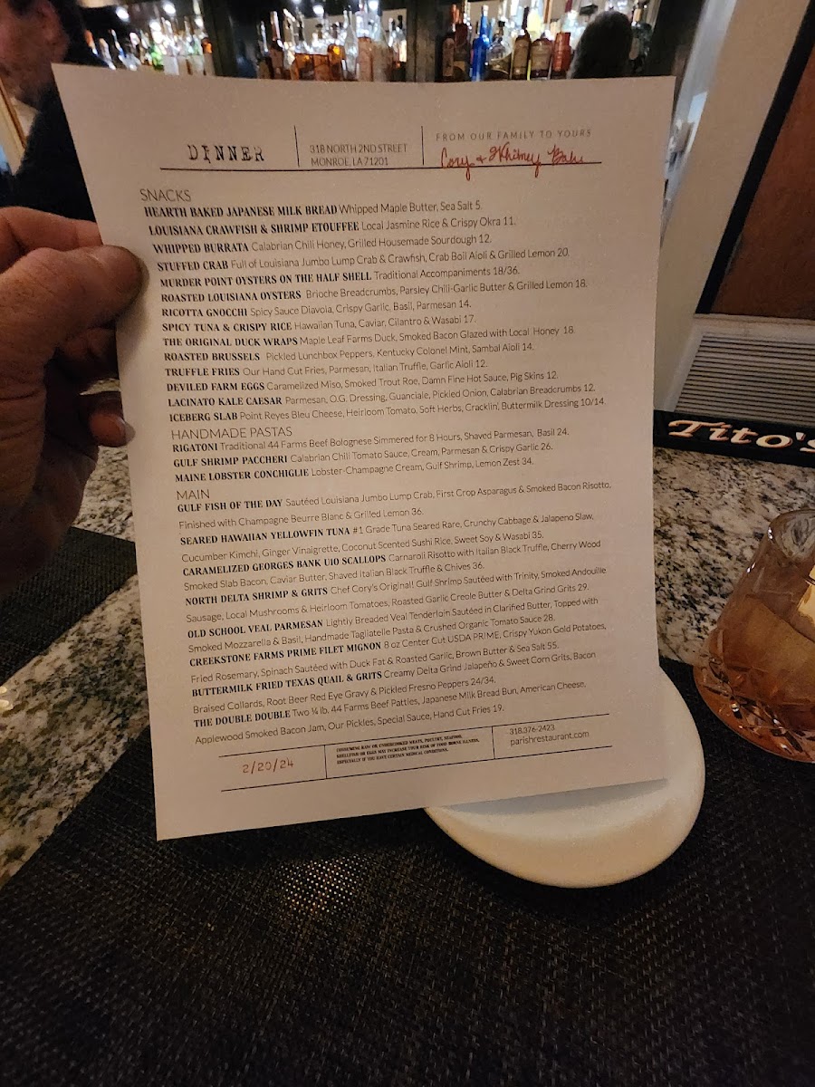 The mains are equally impressive, featuring dishes such as the Pan Roasted Tasmania Salmon and the indulgent Berkshire Pork Shank, both highlighting the restaurant’s commitment to quality. Desserts, like the highly praised Bread Pudding, are crafted to perfection, ensuring a sweet finish to your meal. With exceptional service and a welcoming atmosphere, dining at Parish is not just a meal; it's a memorable experience in the heart of Louisiana.